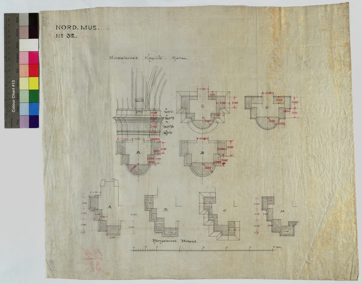 Nord. Mus. No 32. Murpelarnes Kapitäl. Hallen. Hörnpelarnes Förband.