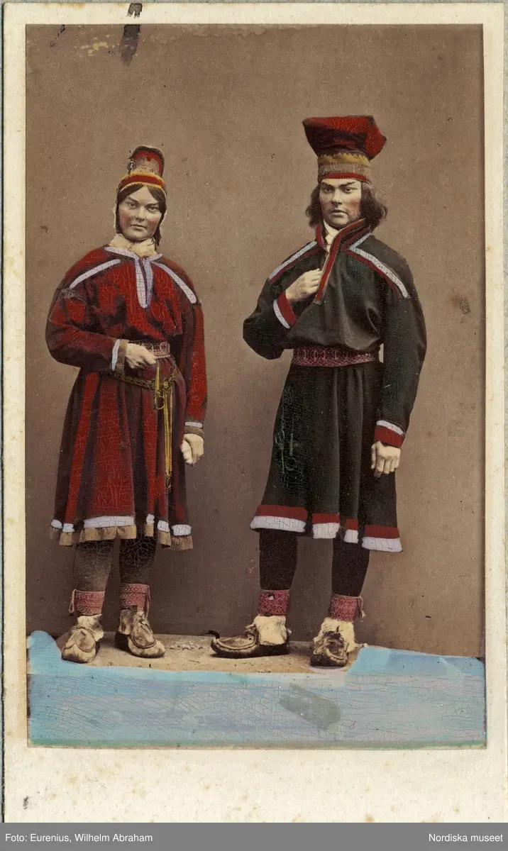 Dräktdockor. En kvinna och en man i samiska dräkter. Handkolorerad.