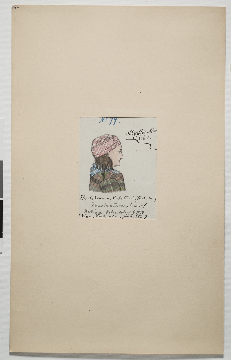 Teckning föreställande kvinna i en Ölmstamössa, buren av Katarina Petersdotter, 1794. Småland.