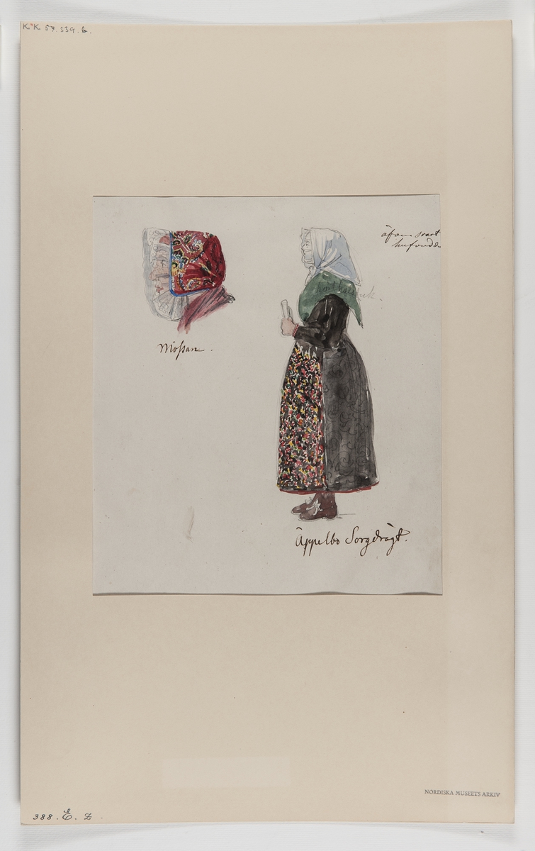 Akvarellerad handteckning av J W Wallander. Kvinnodräkt från Äppelbo, Dalarna. Text: "Äppelbo. Sorgdräkt". Nordiska museets inventarienummer 57339b.