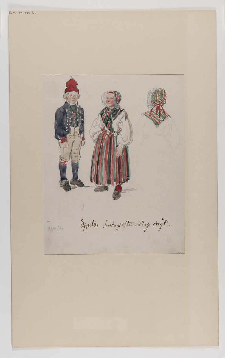 Akvarellerad handteckning av J W Wallander. Mans- och kvinnodräkter från Äppelbo, Dalarna. Nordiska museets inventarienummer 57339b.