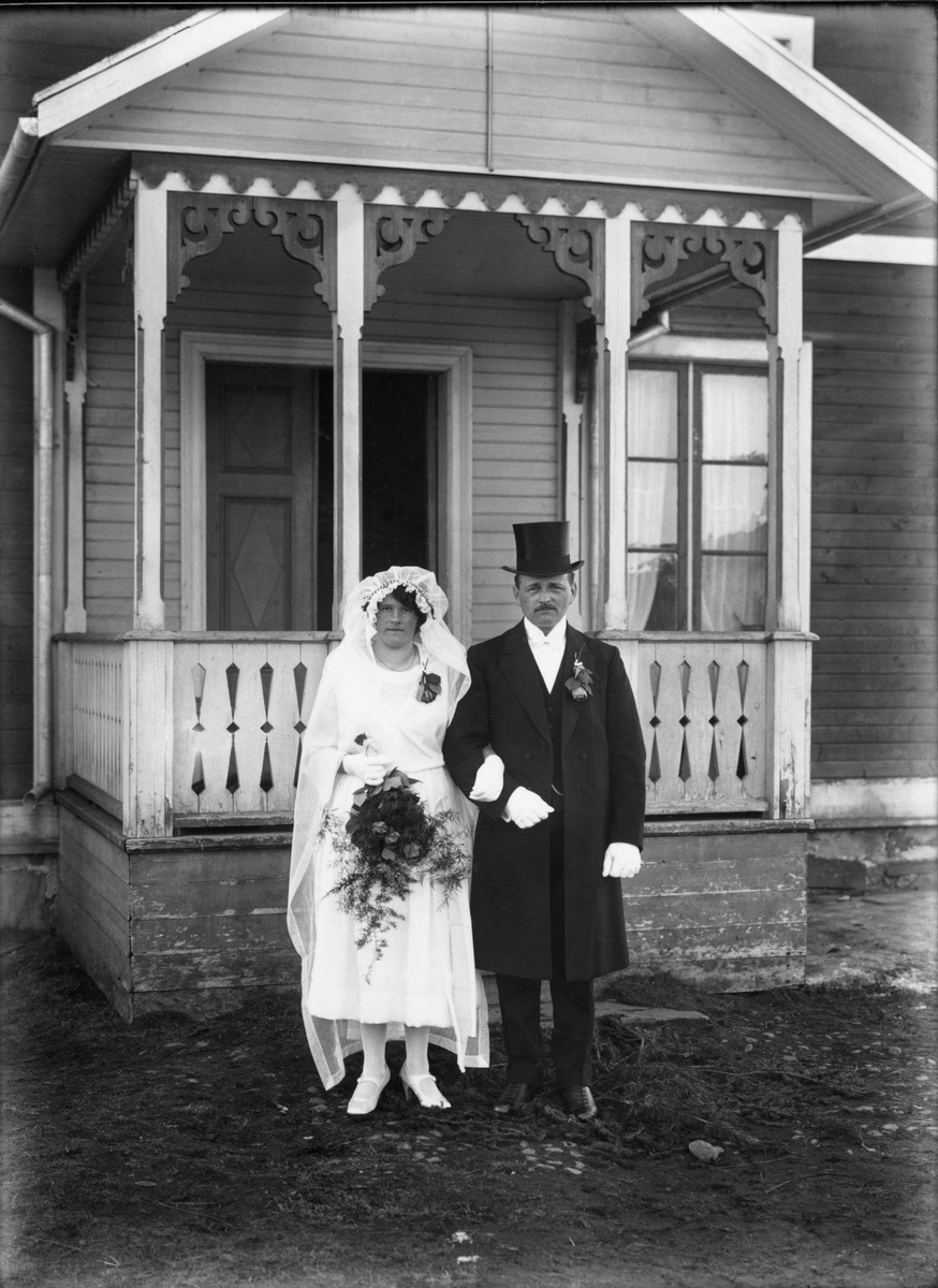 Brudparet Halvarsson. Brudpar står framför hus. Lima, Dalarna.