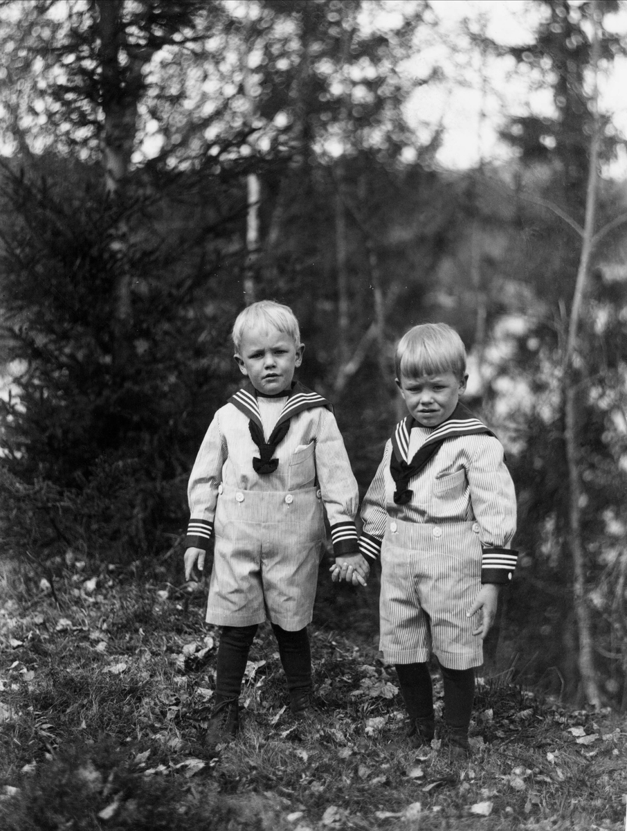 "Bröderna Renhall." Två små pojkar i likadana kläder. Lima socken, Dalarna. Till vänster sannolikt Karl-Erik Renhall.