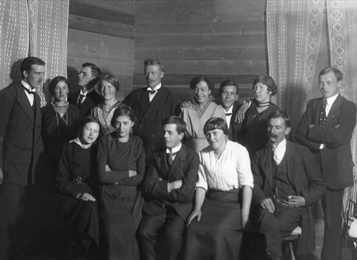 Födelsedagsfest för Lars Siljesvärd. Rad1: Agnes Nyberg. Maria Olsson från Likenäs, Ragnar Olsson, Elsa Nyberg, Botolf Elgren, 2:a raden: George Rensröm, Linnea Larsson, Gunnar Olsson, Jenny Engström, Lars Siljesvärd, Adina Ljungberg, Karl Hedlöf, Signe Skotte o Oskar Nyberg