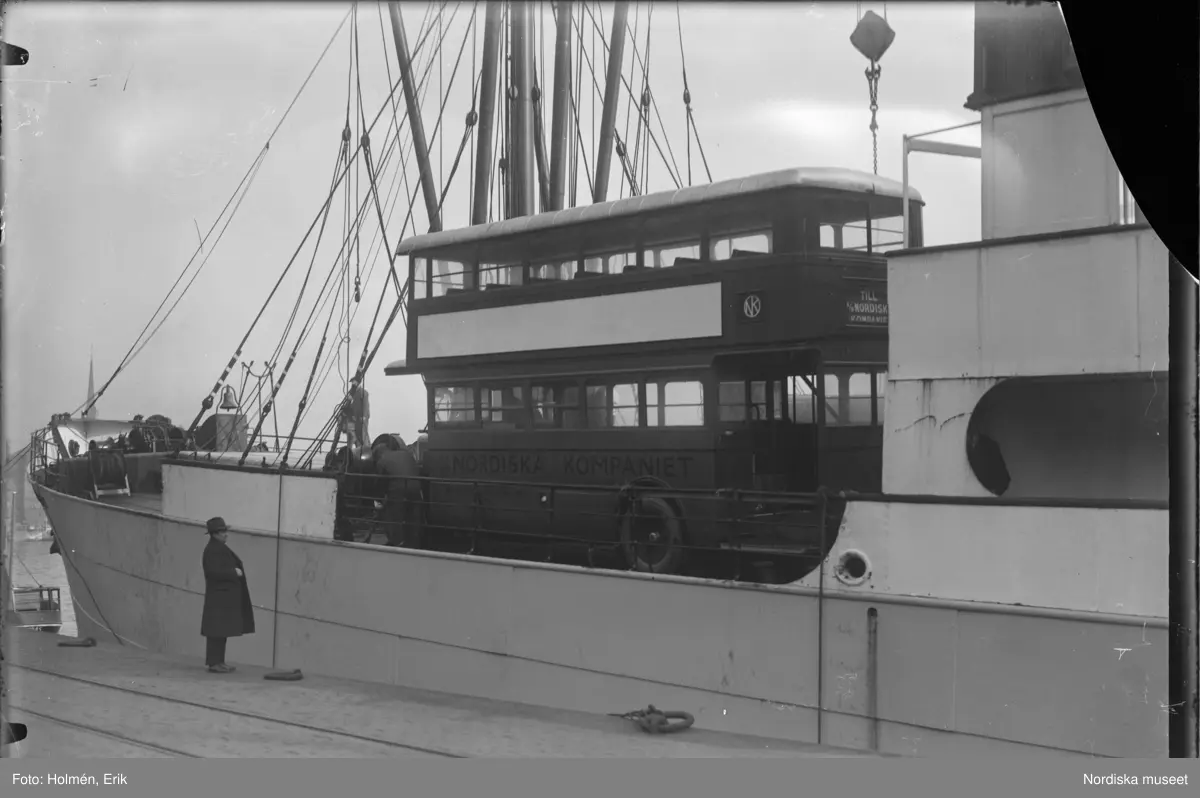 NK fartyg, lastad med en dubbeldäckare "NK-bussen"