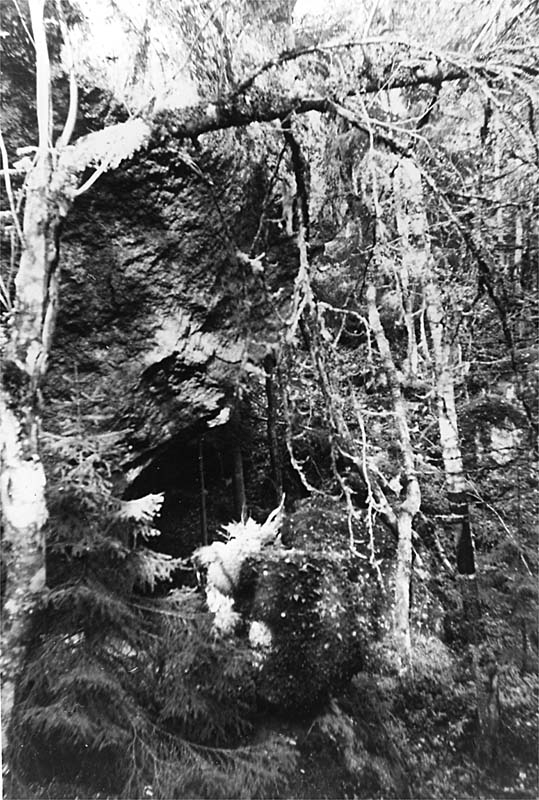 Väldiga mot varandra lutande klippkägglor i urskogsliknande vegetation. Det stormknäckta trädet är en rönn.