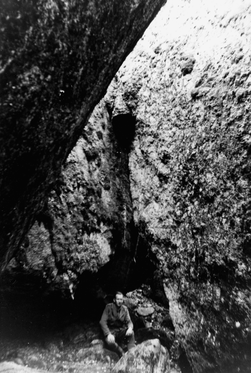 Grotta, stora porten till Stenkälla, en man.