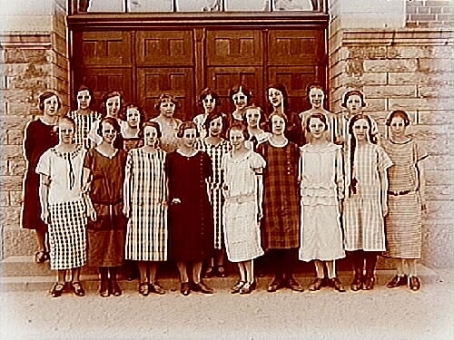 Norra Folkskolan, Högre Folkskolan eller Fortsättningsskolan, 20 skolflickor med lärare, sal 36, klass 3A. Skolbyggnad i bakgrunden.