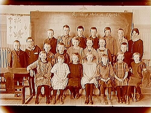 Rynninge skola, klassrumsinteriör, 21 skolbarn med lärare.