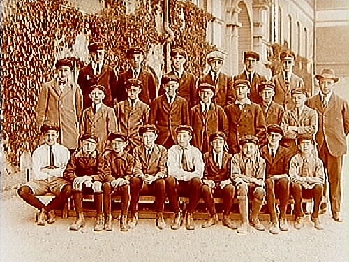 Norra Folkskolan, Högre Folkskolan eller Fortsättningsskolan, 23 skolpojkar med lärare, sal 37. Skolbyggnad i bakgrunden.