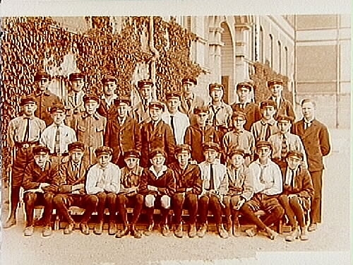 Norra Folkskolan, Högre Folkskolan eller Fortsättningsskolan, 28 skolpojkar med lärare. Skolbyggnad i bakgrunden.