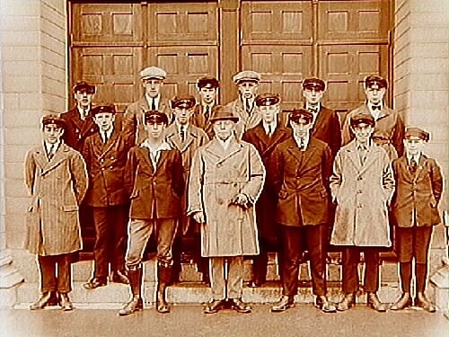 Norra Folkskolan, Högre Folkskolan eller Fortsättningsskolan, 14 skolpojkar med lärare. Skolbyggnad i bakgrunden.