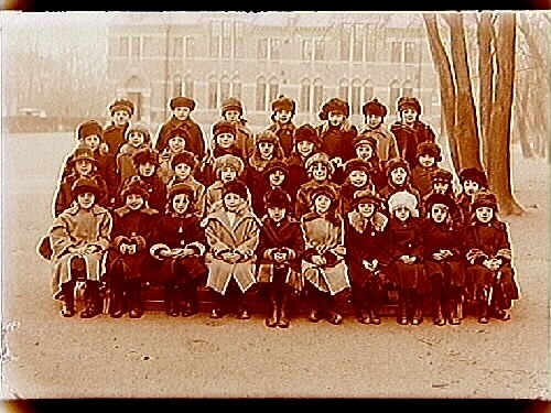 Trädgårdsskolan, 35 skolflickor med lärare. Skolbyggnad i bakgrunden.