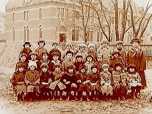 Trädgårdsskolan, 27 skolbarn med lärare. Skolbyggnad i bakgrunden.