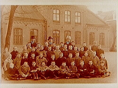 Trädgårdsskolan, skolslöjden, 43 skolpojkar med lärare. Skolbyggnad i bakgrunden.