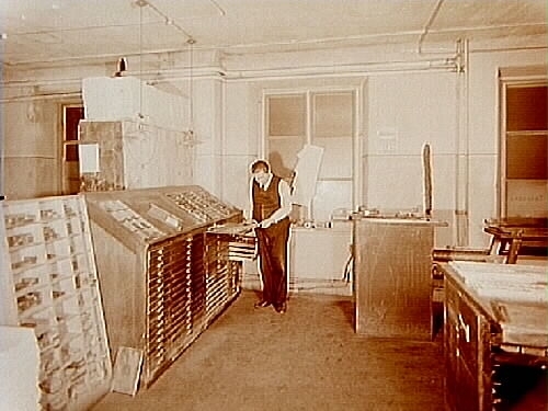 Tidningen Hemmets Vän, interiör från sätteriet, sättaren.