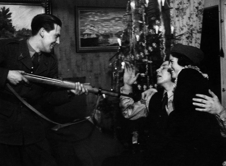 Militär Karlsson skojar genom att "hota" Jörgen och Maj-Britt med gevär.