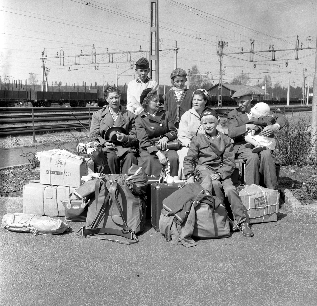 Finnar som flyttar tillbaka till Finland, familjegrupp på järnvägsstationen.