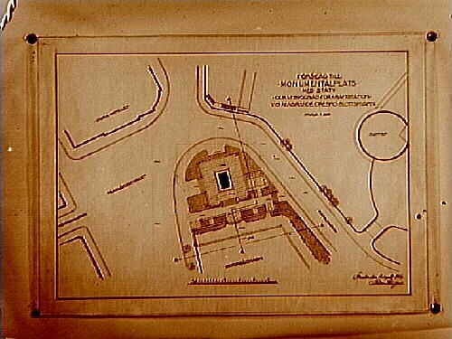 Ritning, förslag till momumentalplats med staty och utbyggnad för kraftstation vid nuvarande Örebro slottskvarn.