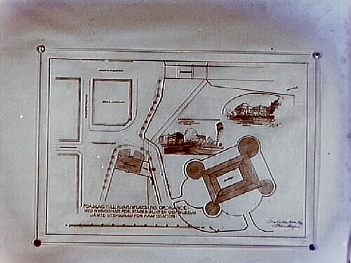 Ritning, förslag till kvarnplatsens ordnande med nybyggnad för stadsbibliotek och museum jämte utbyggnad för kraftstation.
