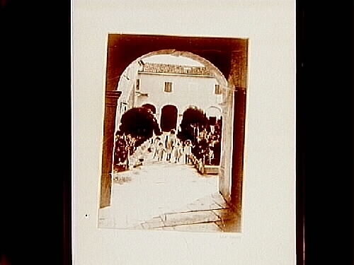 En portal in mot en gård, en kvinna och fyra barn i trädgården.