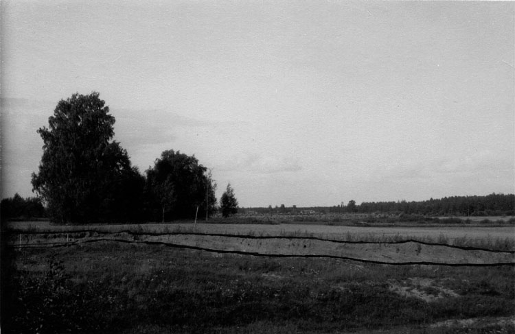 Utsikt mot NO från backen söder om Lännäs kyrka. Backen är en del av rulstensåsen i nord-sydlig riktning. Ett grunt grustag i backen invid vägen. Gårdarna i bakgrunden ligger öster om kyrkan. I augusti 1932.