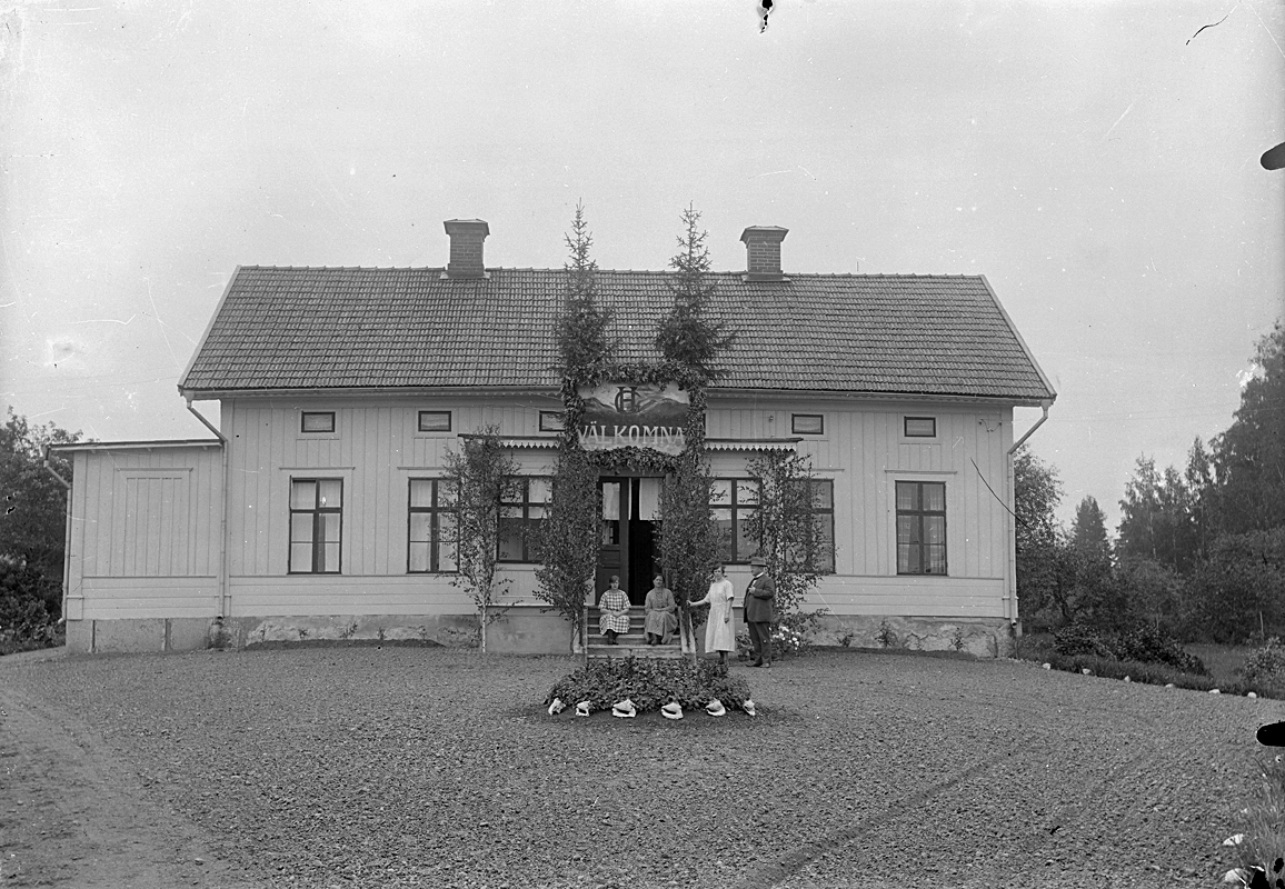 Sällinge Säteri, bostadshus, familjegrupp fyra personer framför huset.
