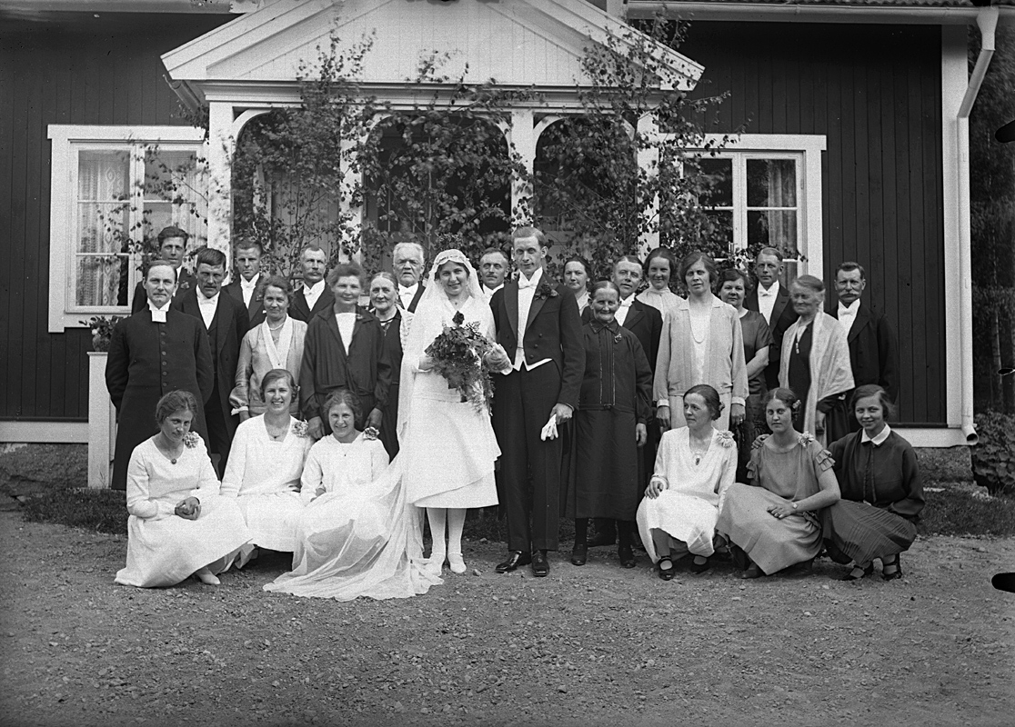 Bröllop, brudpar och bröllopsgäster, framför ett bostadshus.