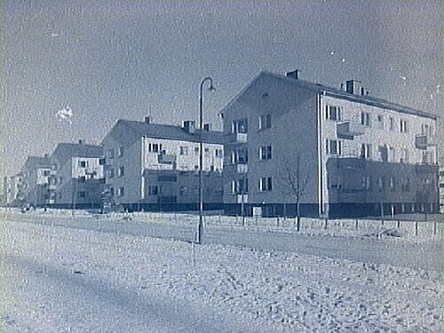 Fyra trevånings bostadshus med balkonger.
