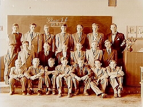 Olaus Petriskolan, klassrumsinteriör, 20 pojkar med lärare Sven Örbrink, klass 8A, sal 26.