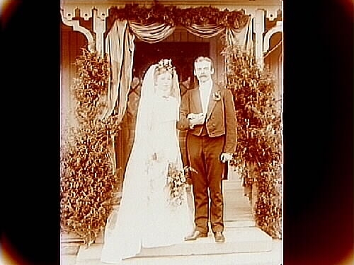 Brudpar på trappan till huset.
