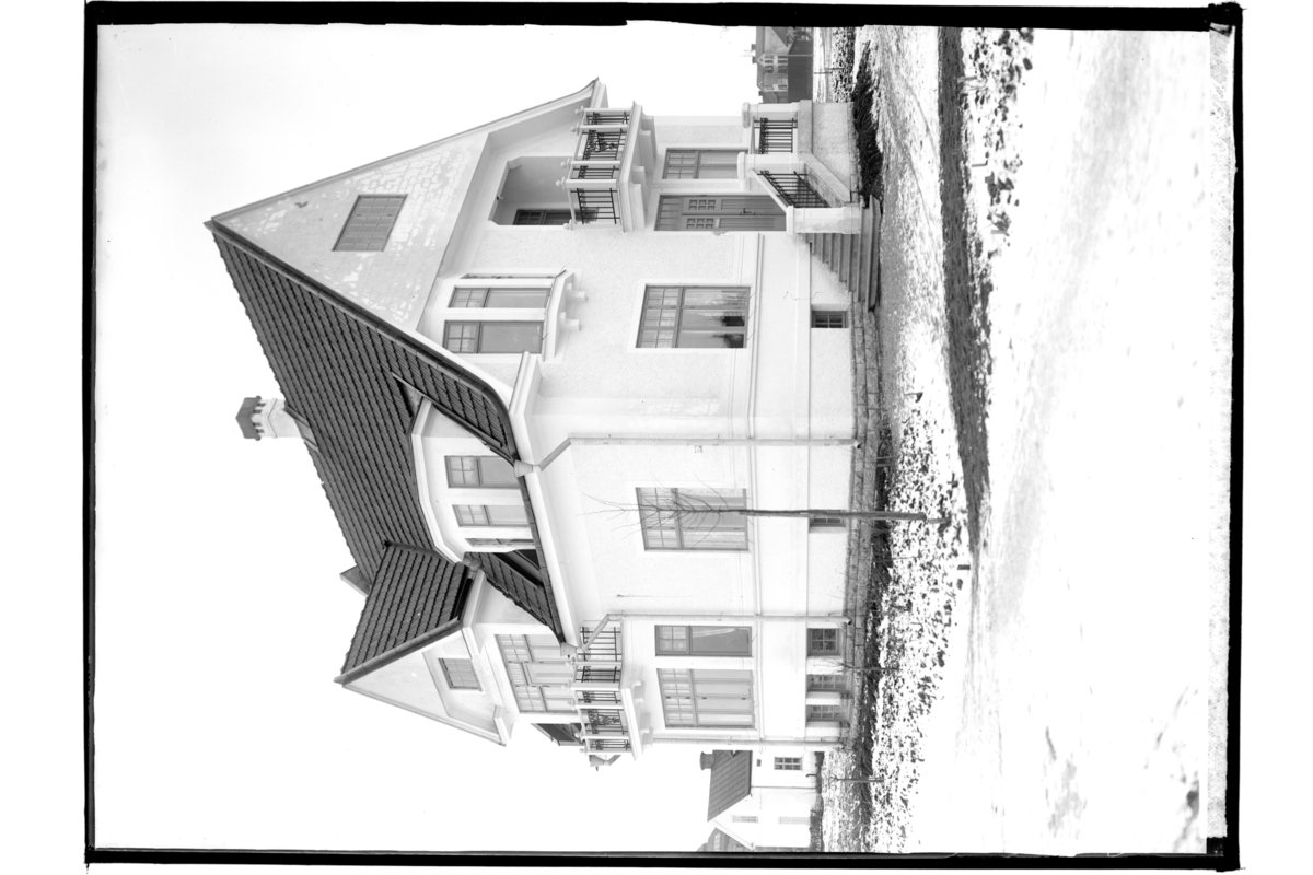 Trähus i en och halvvåning med jugendpräglad fasad. Reveterat.