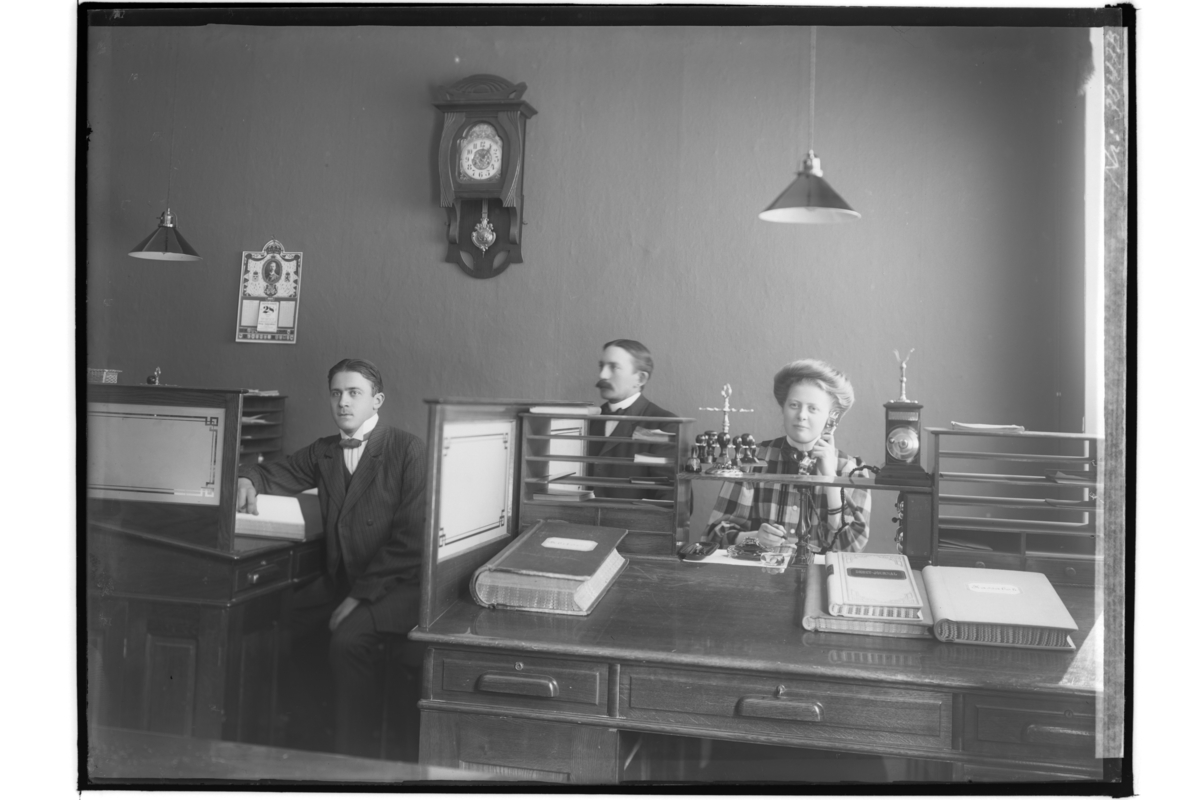 Titel: Sko & Läder, kontorsinteriör, 2 män och en kvinna. Grosshandlare Emil Edling
