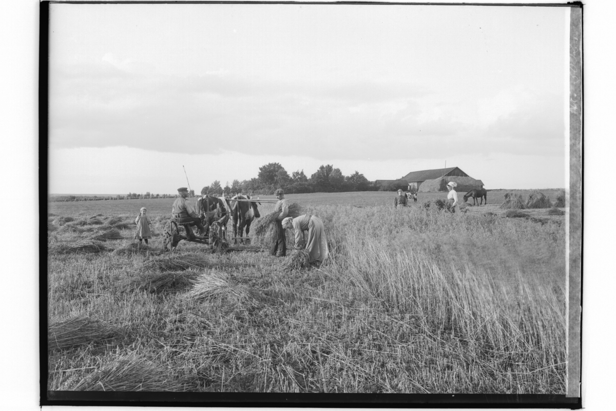 Skördebild. Två oxar spända framför slåttermaskin, 6 personer och en häst.