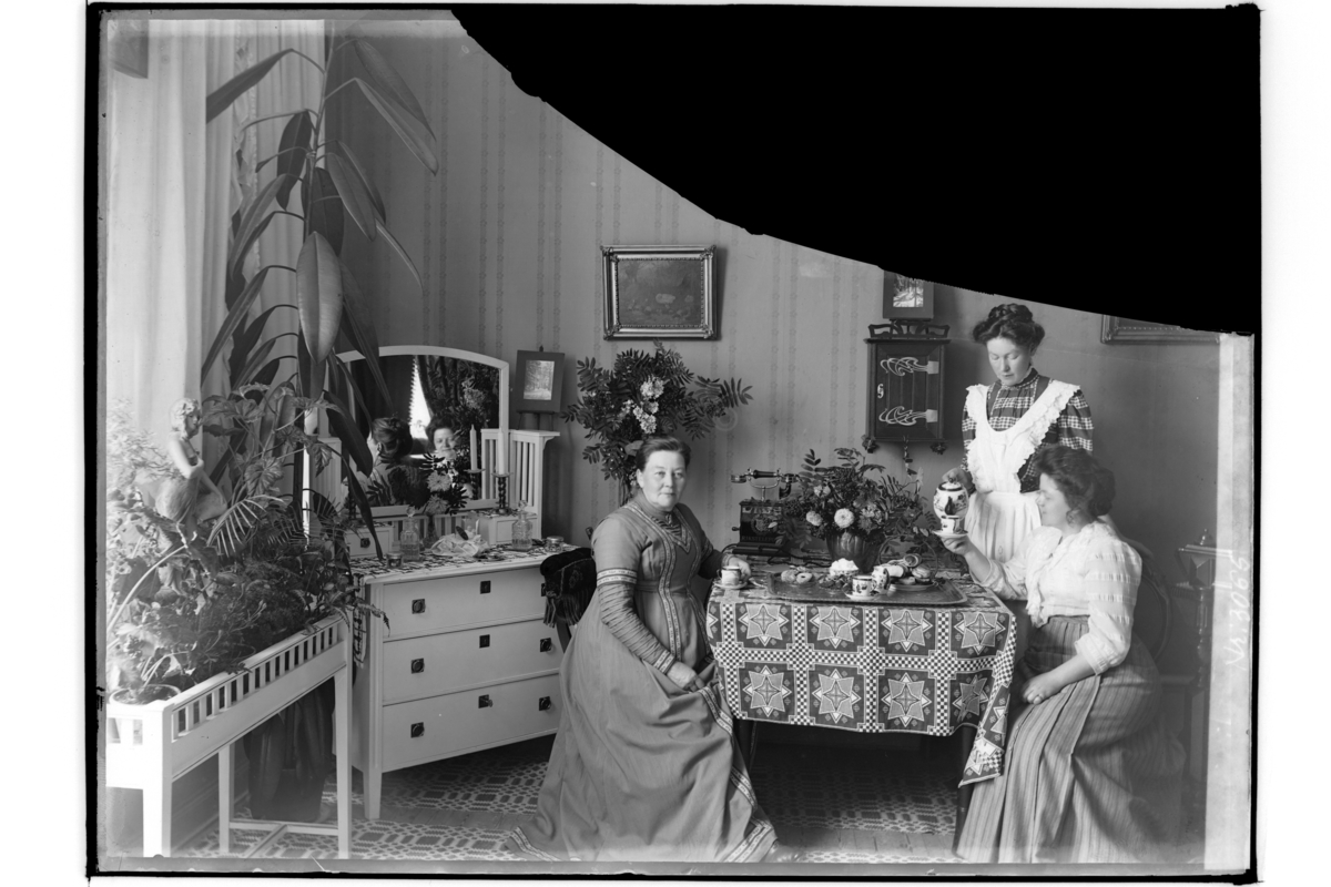Rumsinteriör, 3 kvinnor vid kaffebordet.