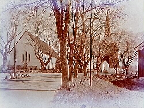 Sköllersta kyrka med klockstapeln och stigluckan.