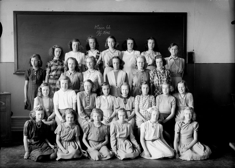 Vasaskolan, klassrumsinteriör, 26 flickor med lärarinna fröken Maja Vilén.