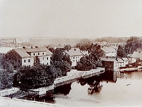 Karolinska skolan till vänster, från Slottet mot öster. Byggnader utefter Olaigatan och Svartån.