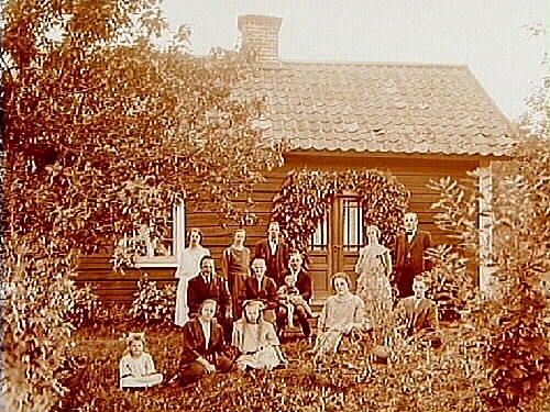 Släktgrupp 14 personer framför stugan.