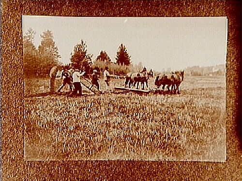 Täckdikning med fyra hästar och fyra män.