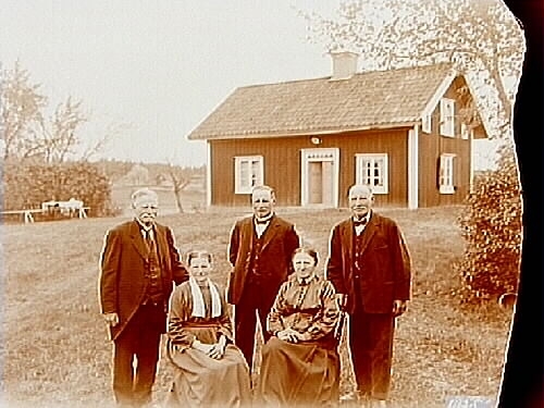 Envånings bostadshus, släktgrupp 5 personer framför huset.
