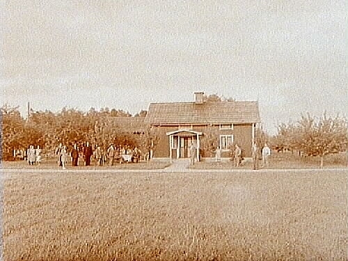 En och en halvvånings bostadshus med förstebro. Sexton vuxna och två barn framför huset.