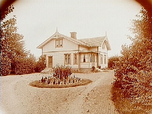 Vinkelbyggt envånings bostadshus med glasad veranda, snickarglädje på taknocken.