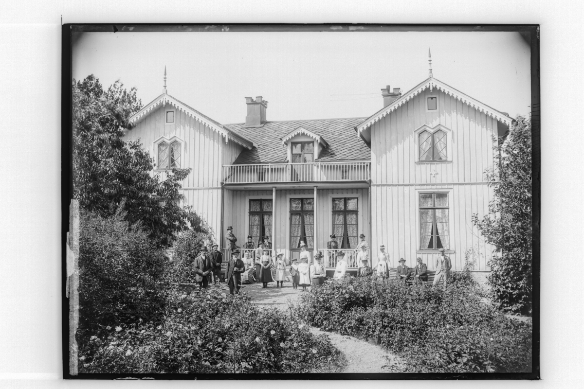 Skölvs gård, tvåvånings bostadshus med två frontespisar, 22 personer framför huset.