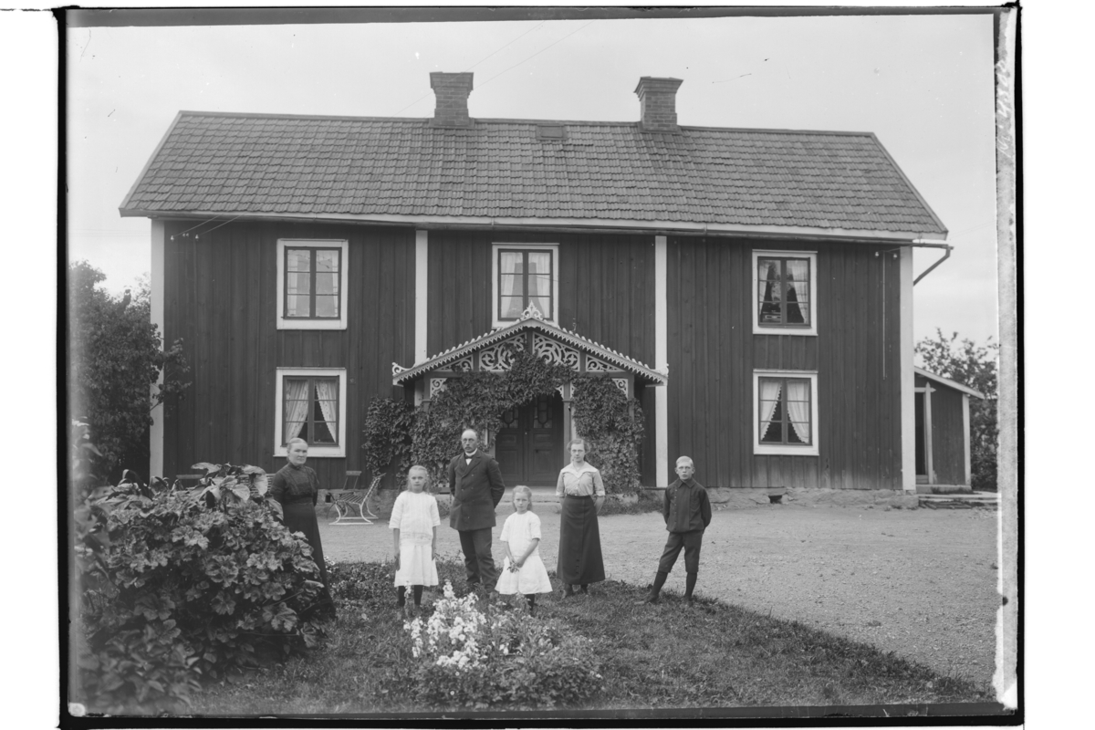 Tvåvånings bostadshus med veranda med snickarglädje.