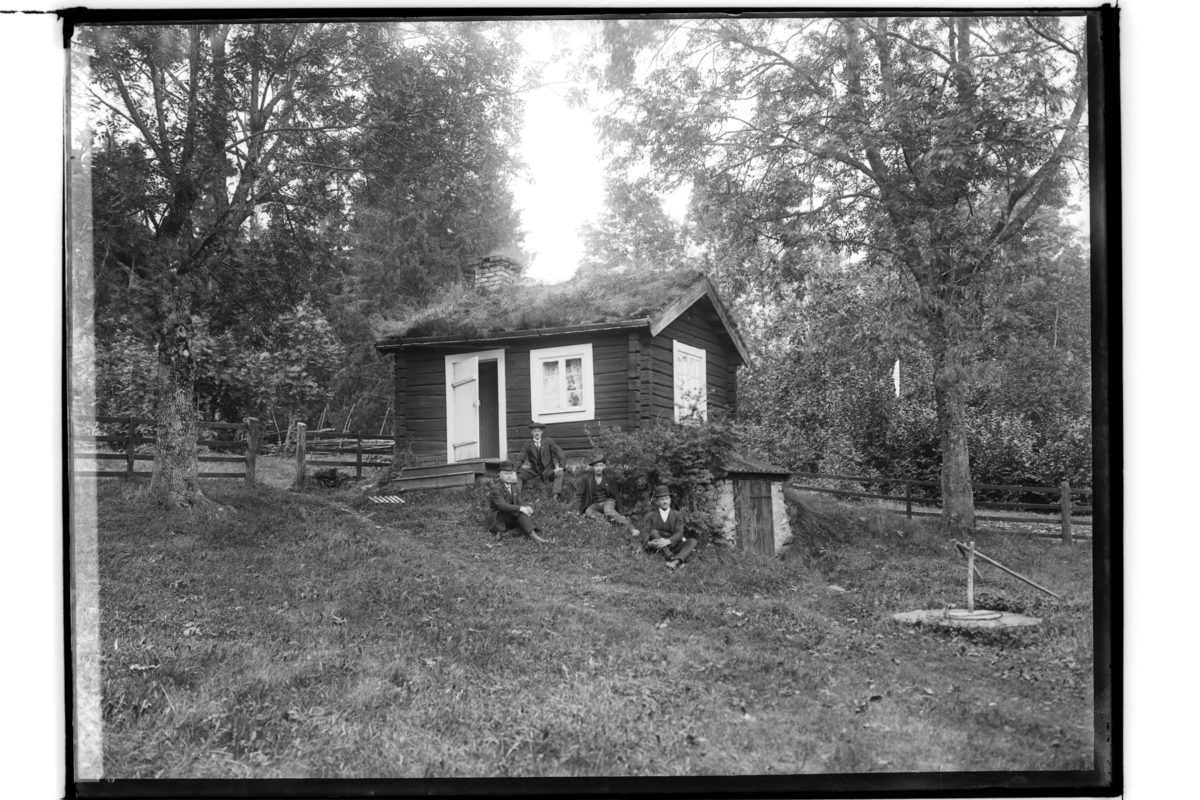 Knuttimrad jaktstuga, 4 herrar framför stugan.