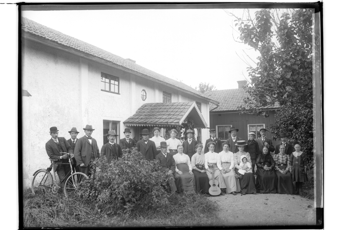 Tvåvånings äldre reveterat bostadshus, 24 personer framför byggnaden.