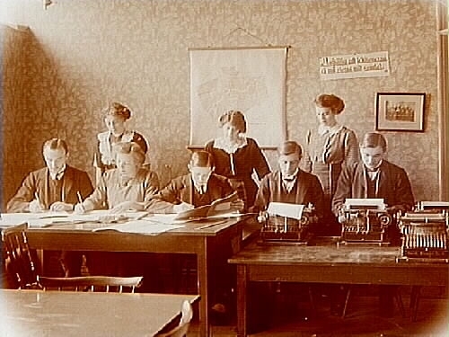 Örebro Praktiska Språk & Handelsskola, rumsinteriör, tre personer skriver, två män skriver på skrivmaskin och tre kvinnor tittar på.