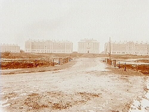 Fyra fyrvånings kasernbyggnader och en trevånings.