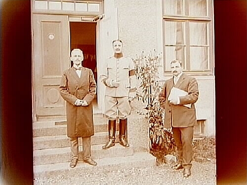 Soldathemmet, grupp, 3 personer framför byggnaden.